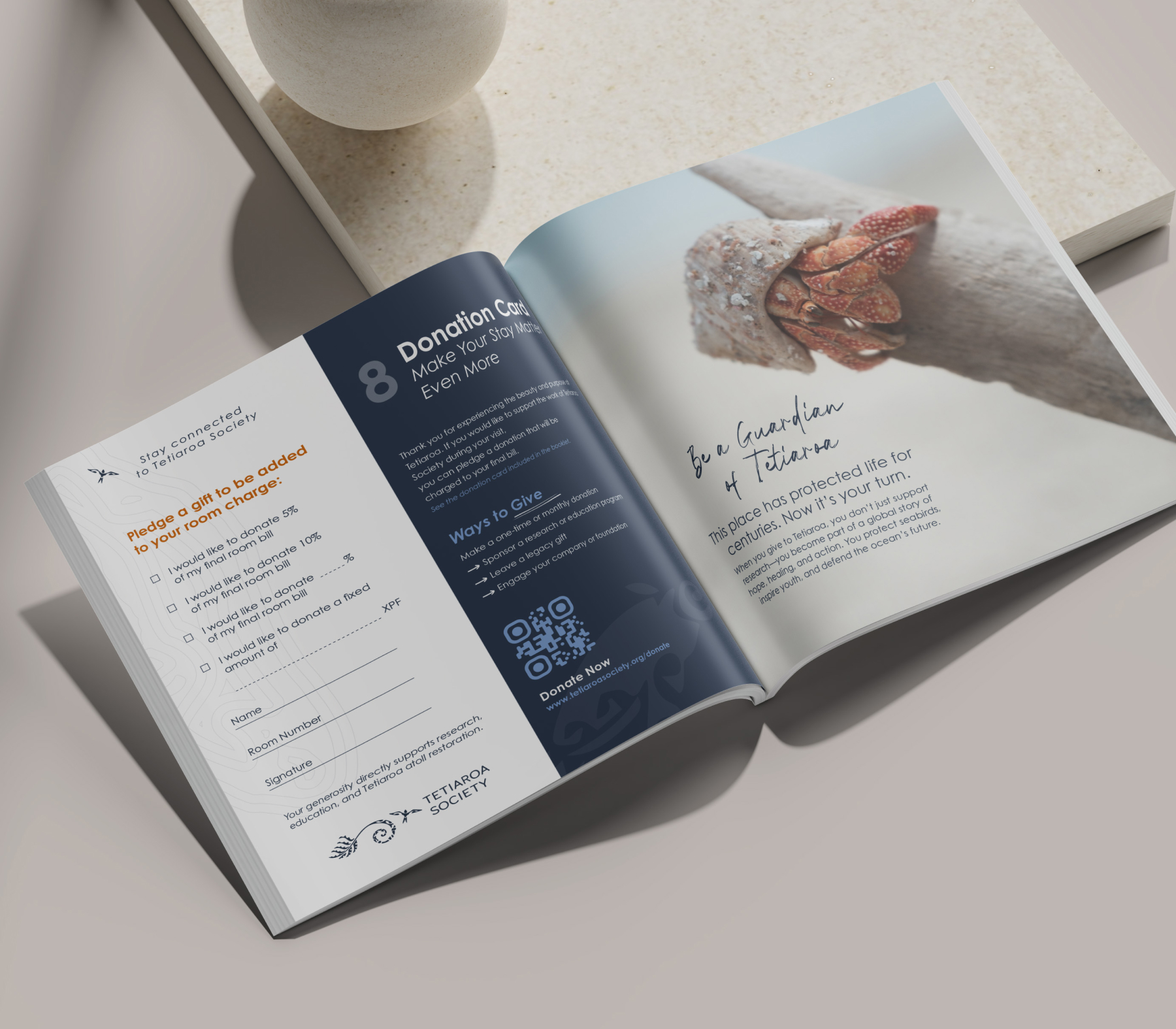 La brochure se termine par une partie détachable, que les clients peuvent remplir pour ajouter directement à leur note le montant du don qu’ils souhaitent verser à Tetiaroa Society.