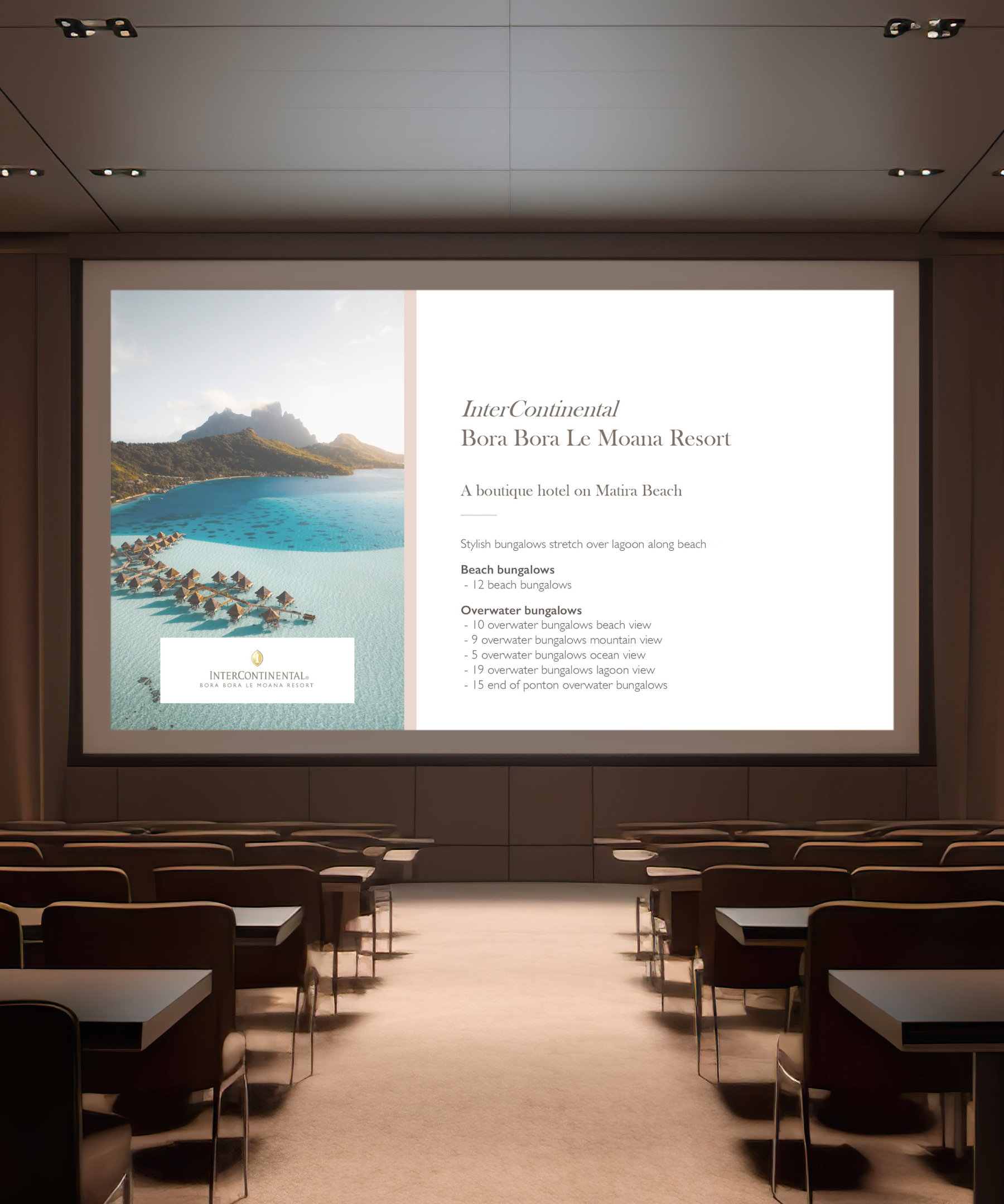 L’objectif était de créer un PowerPoint moderne et cohérent, respectant la charte graphique InterContinental tout en valorisant la diversité et l’excellence de ces trois destinations.