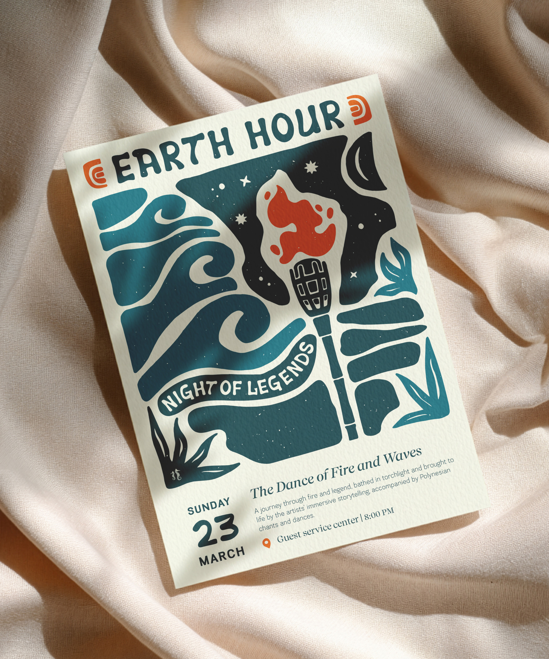 Engagé dans la protection de l’environnement, The Brando s’associe naturellement à cet événement. Pour cette occasion, j’ai conçu l’affiche invitant les clients du resort à un dîner éclairé à la bougie, enrichi de chants, de légendes polynésiennes contées et de danses afin de célébrer cette heure dédiée à la planète.